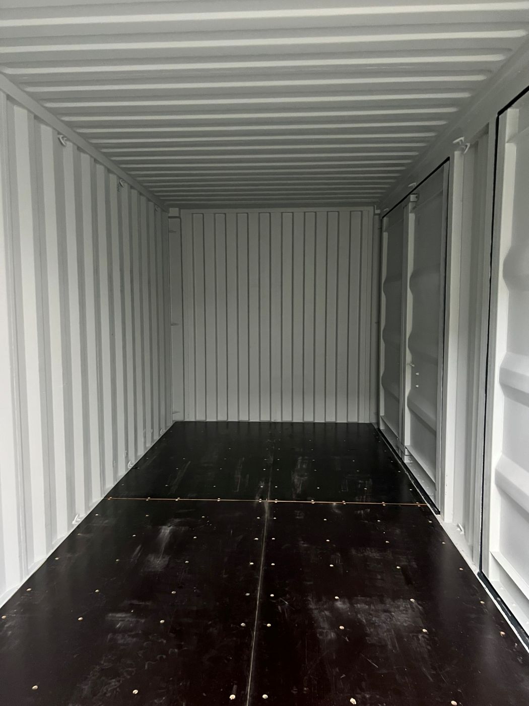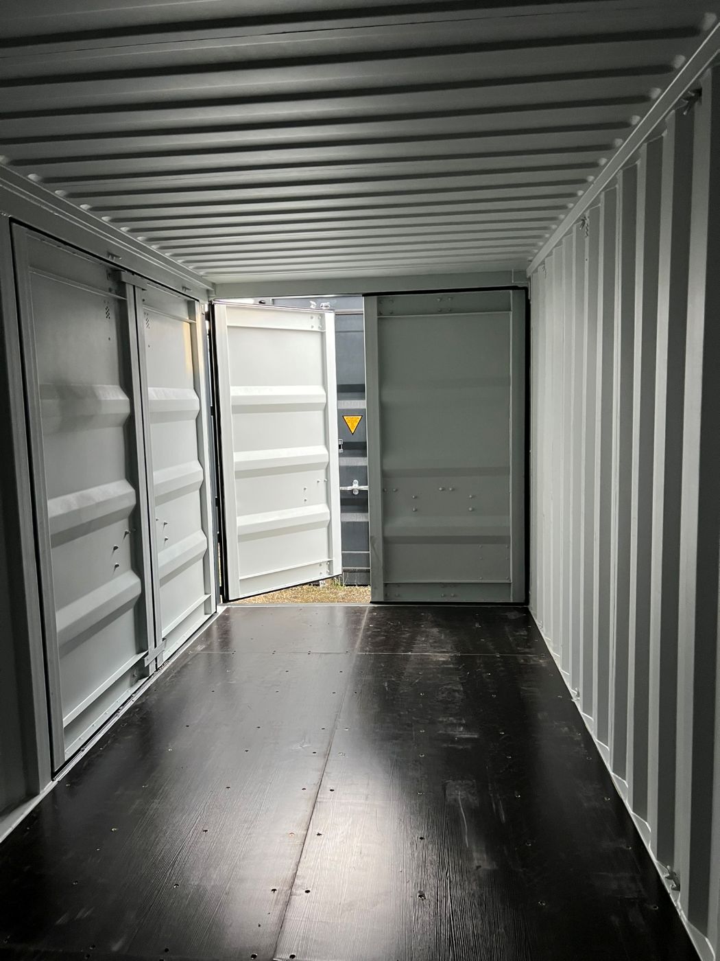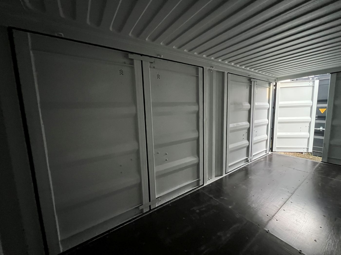 Side-doors shipping container. The container can be opened from one end and additionally has large full-length side-opening doors. The product images show the specific shipping containers that are currently in stock and available for sale. The container may have cosmetic defects.