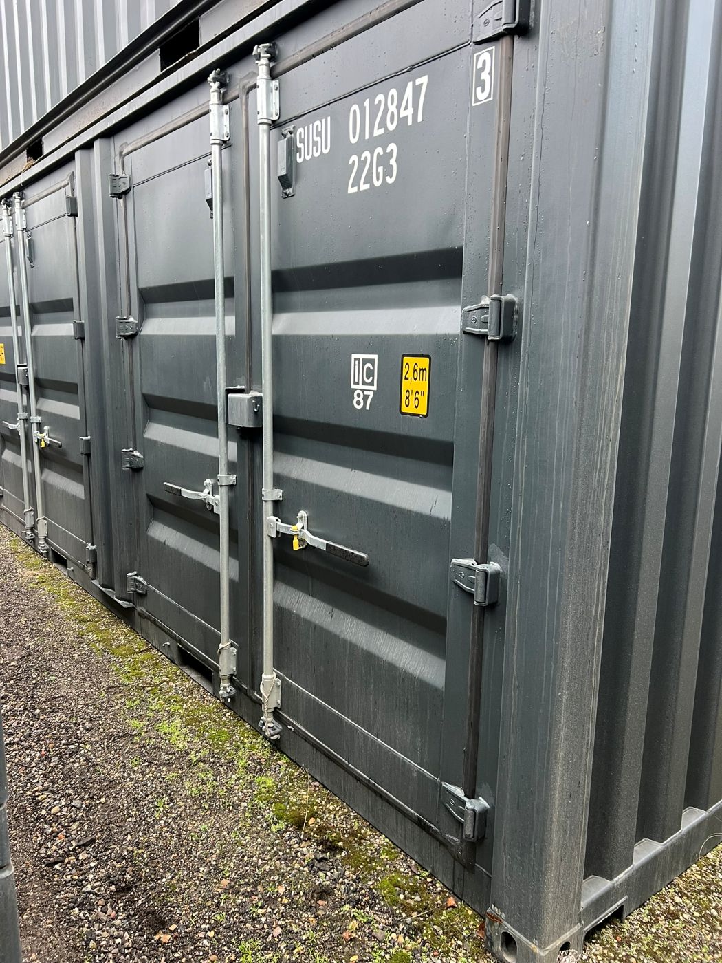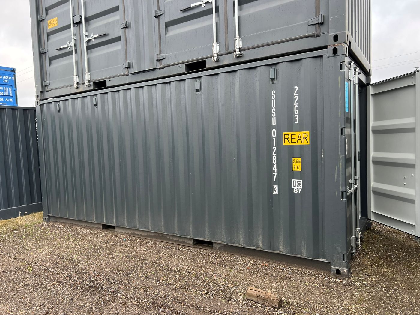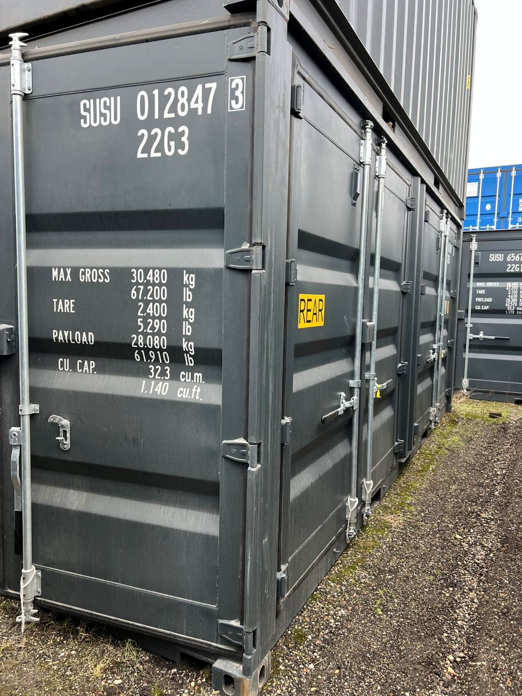 Side-doors shipping container. The container can be opened from one end and additionally has large full-length side-opening doors. The product images show the specific shipping containers that are currently in stock and available for sale. The container may have cosmetic defects.